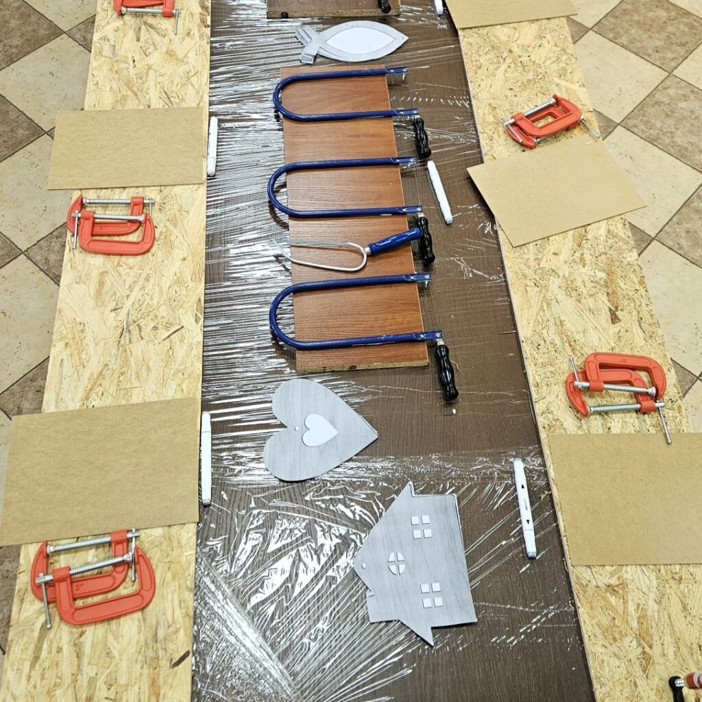 Zabawa dla wszystkich lubiących majsterkowanie. Każdy uczestnik dostanie deseczkę z której będzie mógł wyciąć specjalnymi narzędziami dowolny kształt. W drewnie możemy wyciąć przeróżne kształty: miecz, tarczę, koronę, ludzika. Możesz skorzystać z naszych pomysłów lub zaprojektować swój własny wzór.