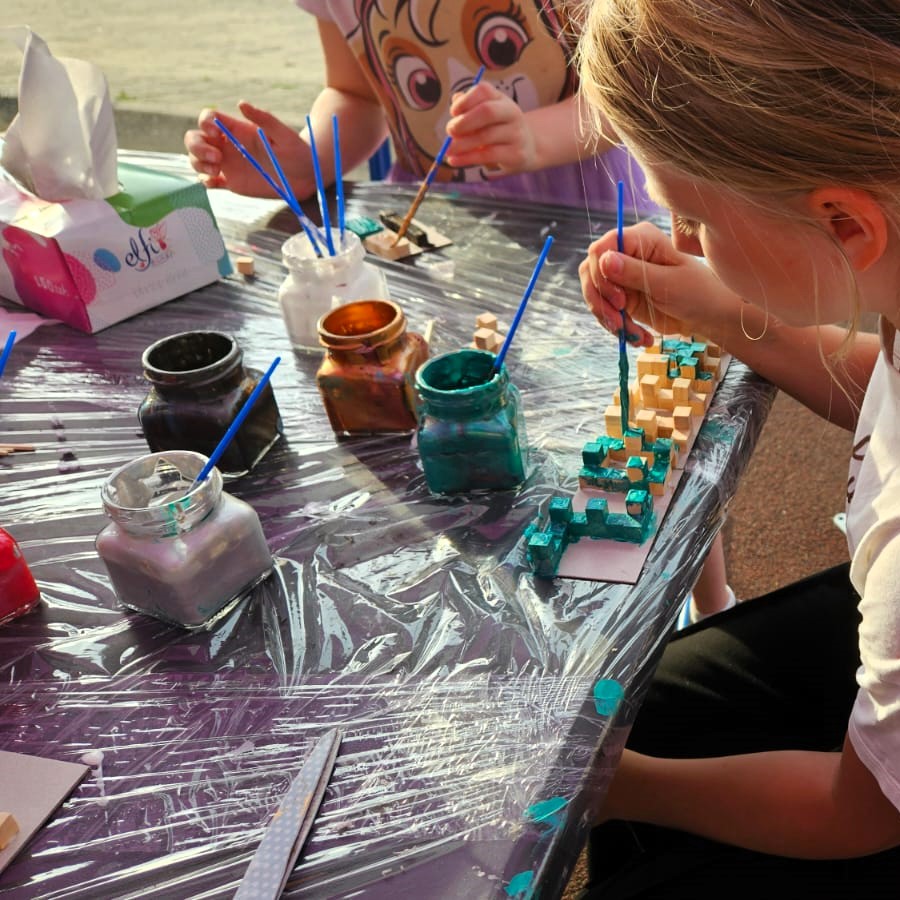 Drewniane kosteczki Z małych drewnianych kosteczek można ułożyć swoje imię, dowolny kształt lub nawet coś zbudować. Gdy nasze dzieło jest gotowe możemy je pomalować na ulubione kolory. Zabawa kosteczkami na pewno przyniesie wszystkim wiele artystycznej frajdy!