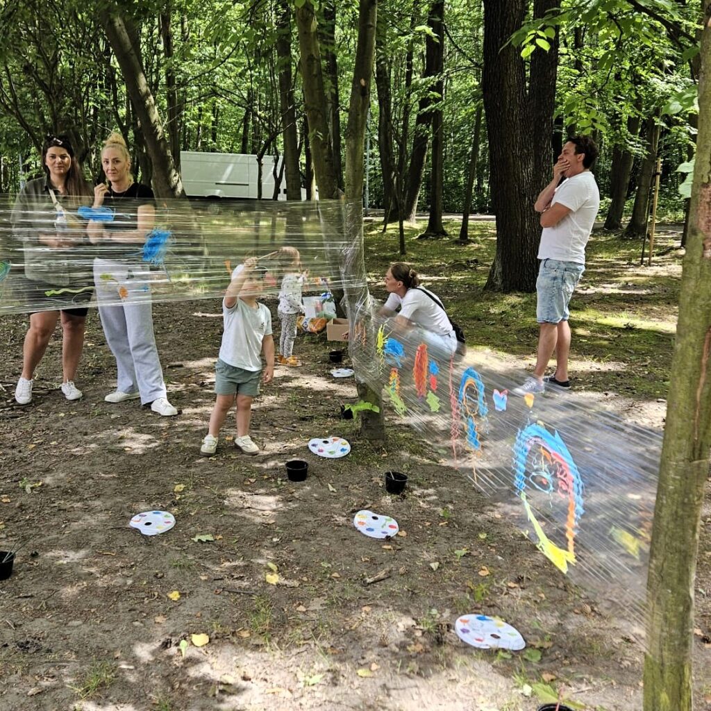 Większość dzieci korci, żeby zmalować coś na ścianie. Malowanie na foli być może zaspokoi tę pokusę, która najczęściej nie jest w smak dorosłym. Proponujemy malowanie kolorowymi farbami na przeźroczystej foli rozciągniętej między dwoma krzesłami lub drzewami (jeśli dane wydarzenie odbywa się na dworze). Inną propozycją jest malowanie białą farbą na folii czarnej. Dzieci mogą malować na foli za pomocą pędzelków lub własnych rąk. Dobra zabawa gwarantowana!